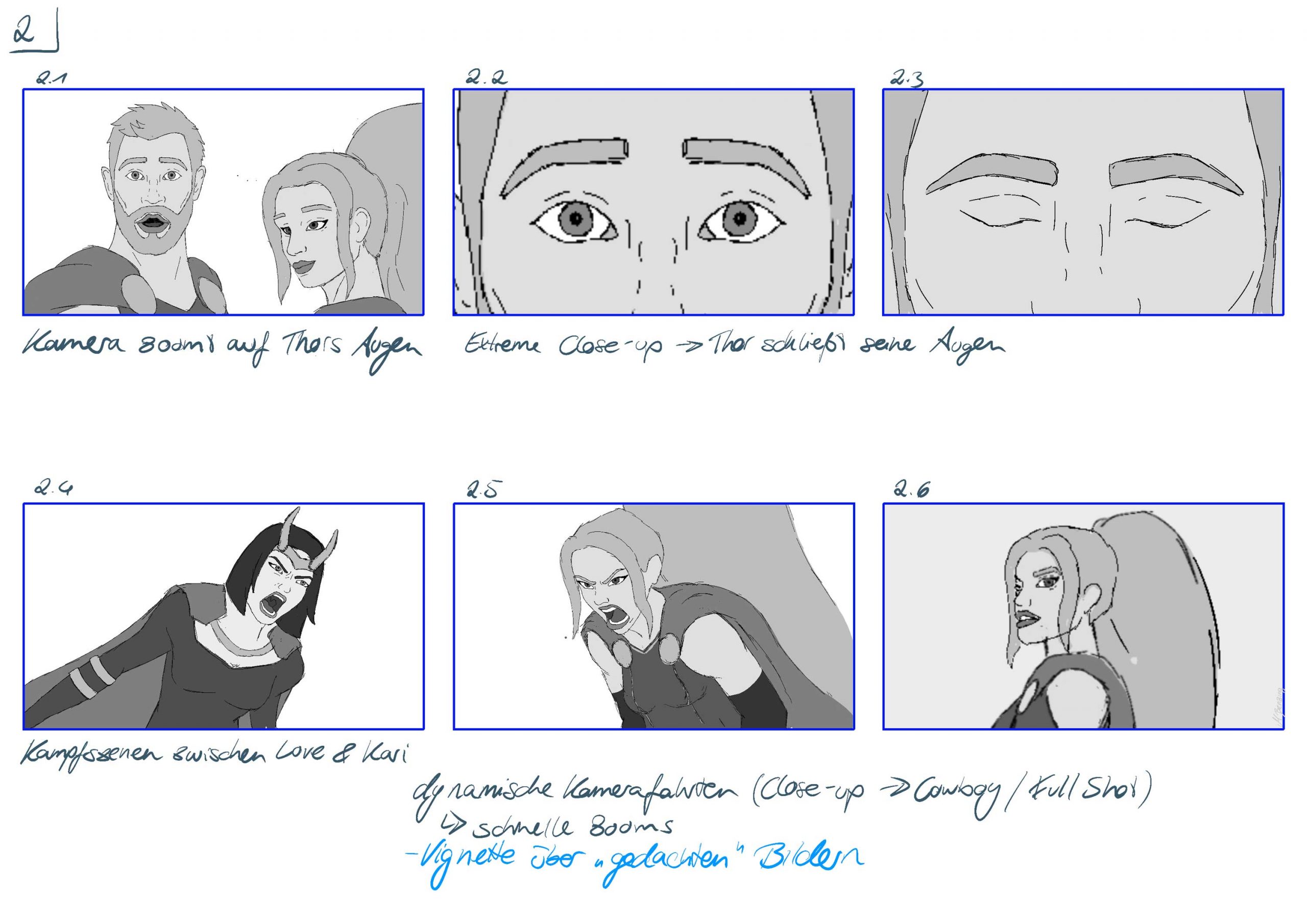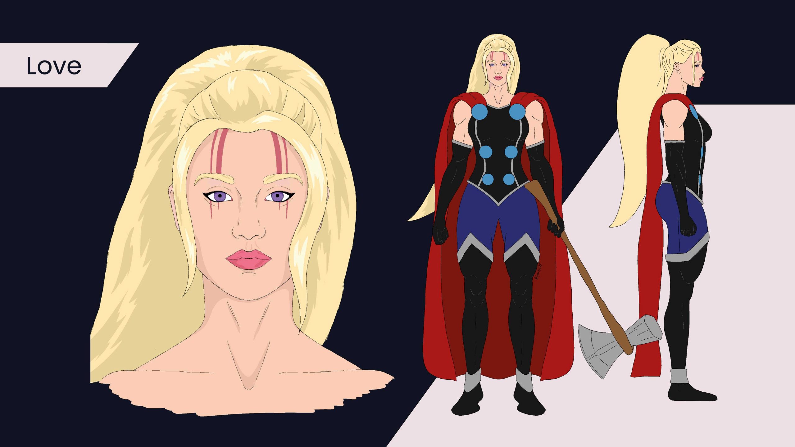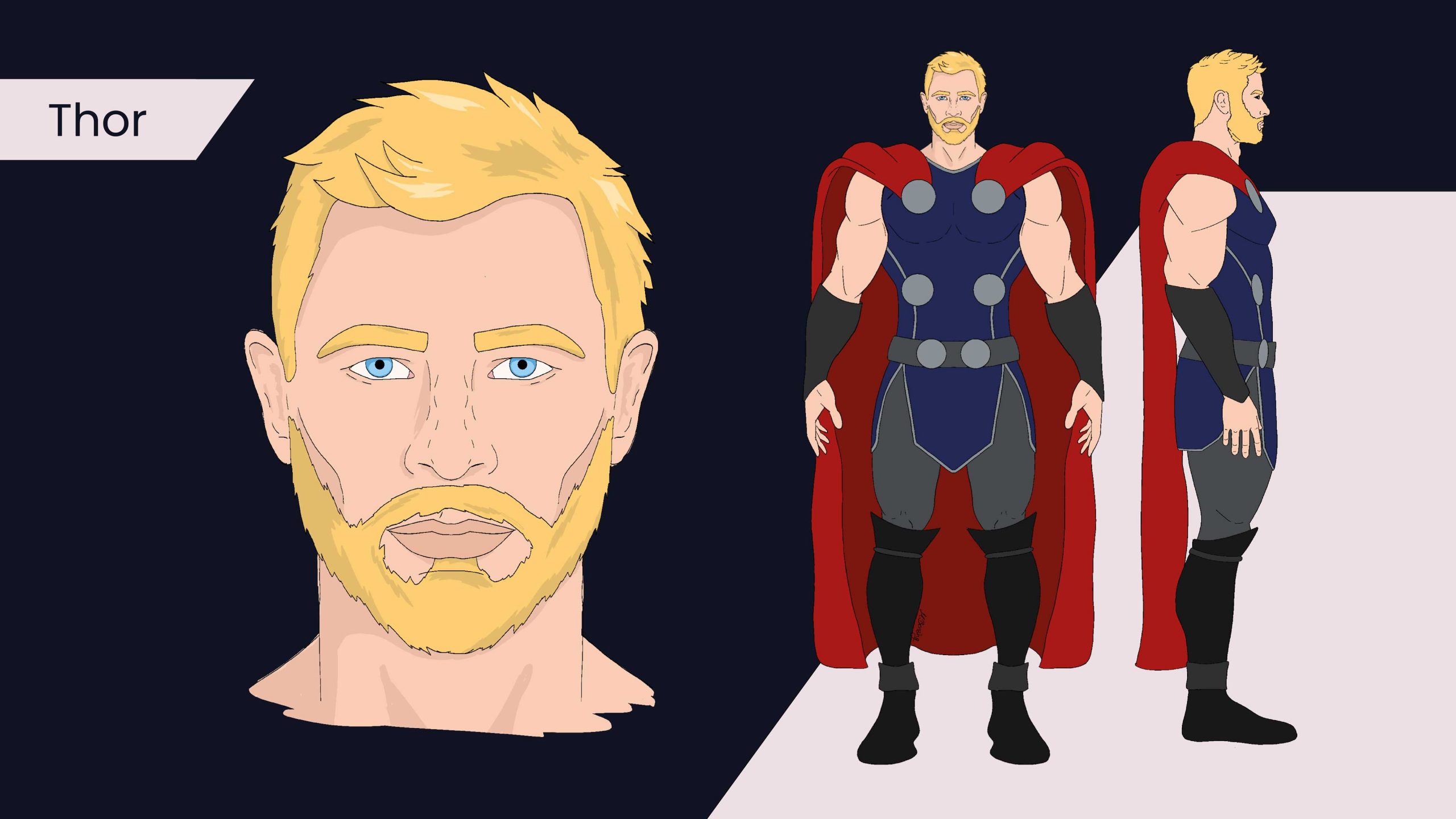 In this I noted the character development of Thor over time. In the last installment of the Thor film series so far, Thor: Love and Thunder, the role of fatherhood falls into Thor’s hands, and this new dynamic between Thor and his adopted daughter inspired me to create a 2D short film that ties into the end of that film.