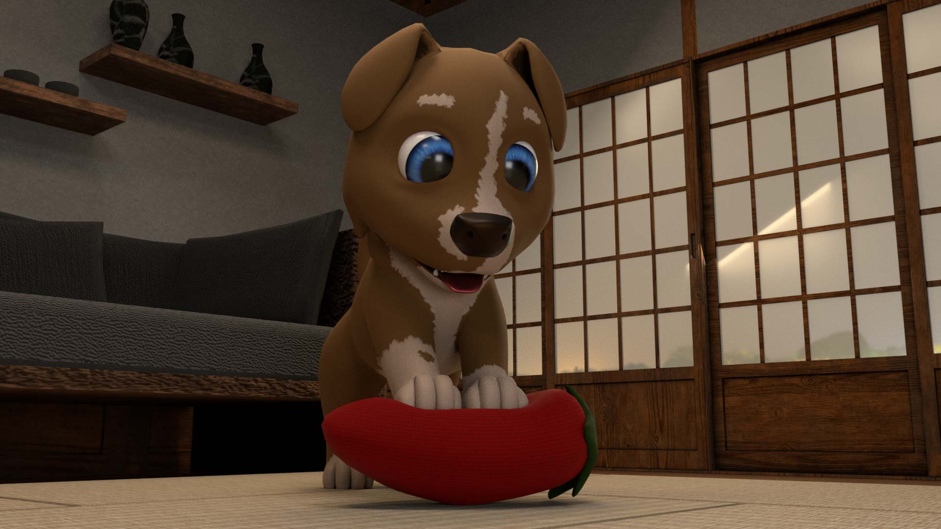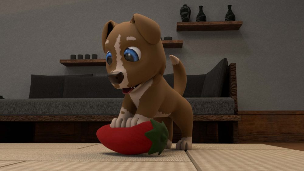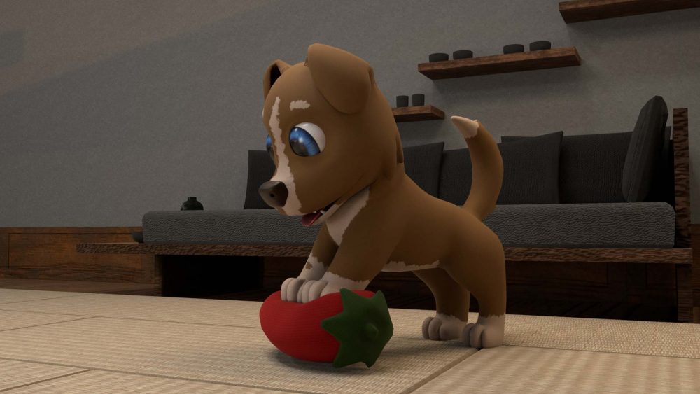 The task for this project was to create a 3D Character and add a fitting environment. I created this little puppy playing with his toy strawberry in a living room.