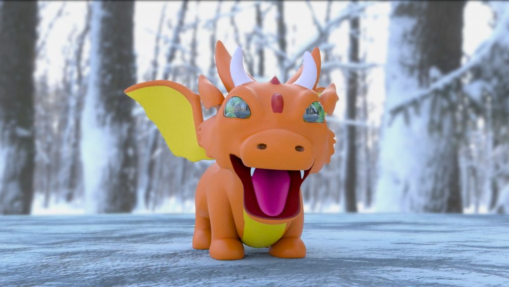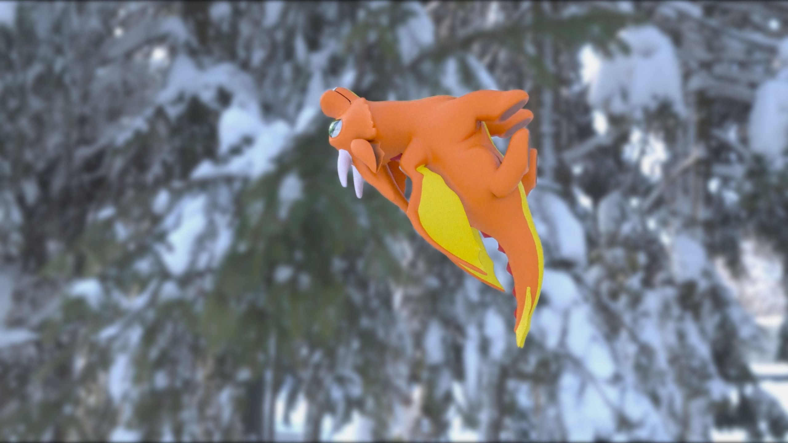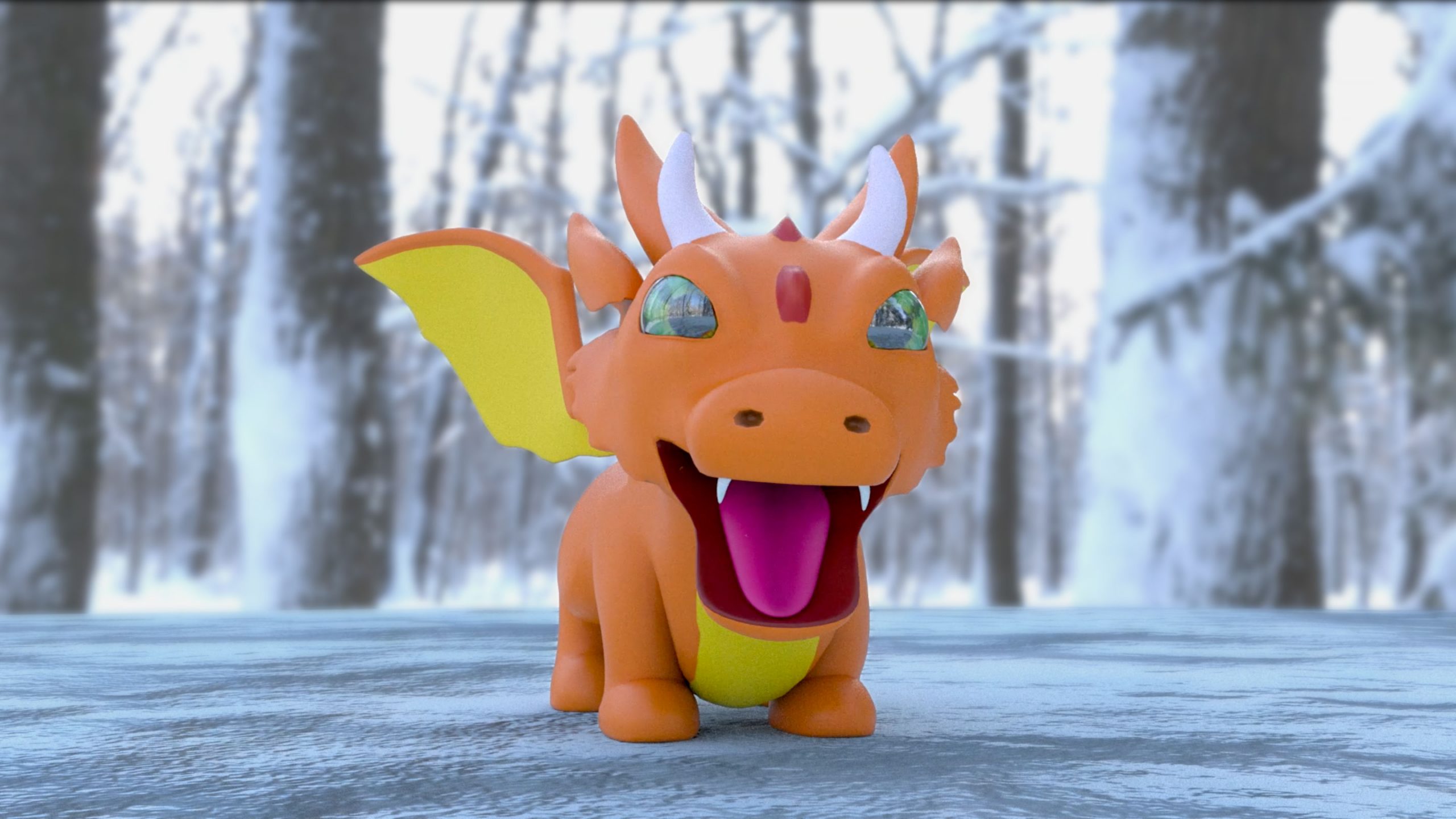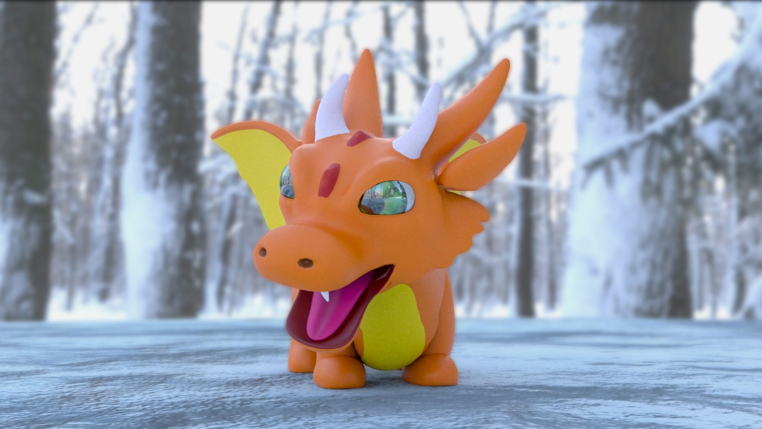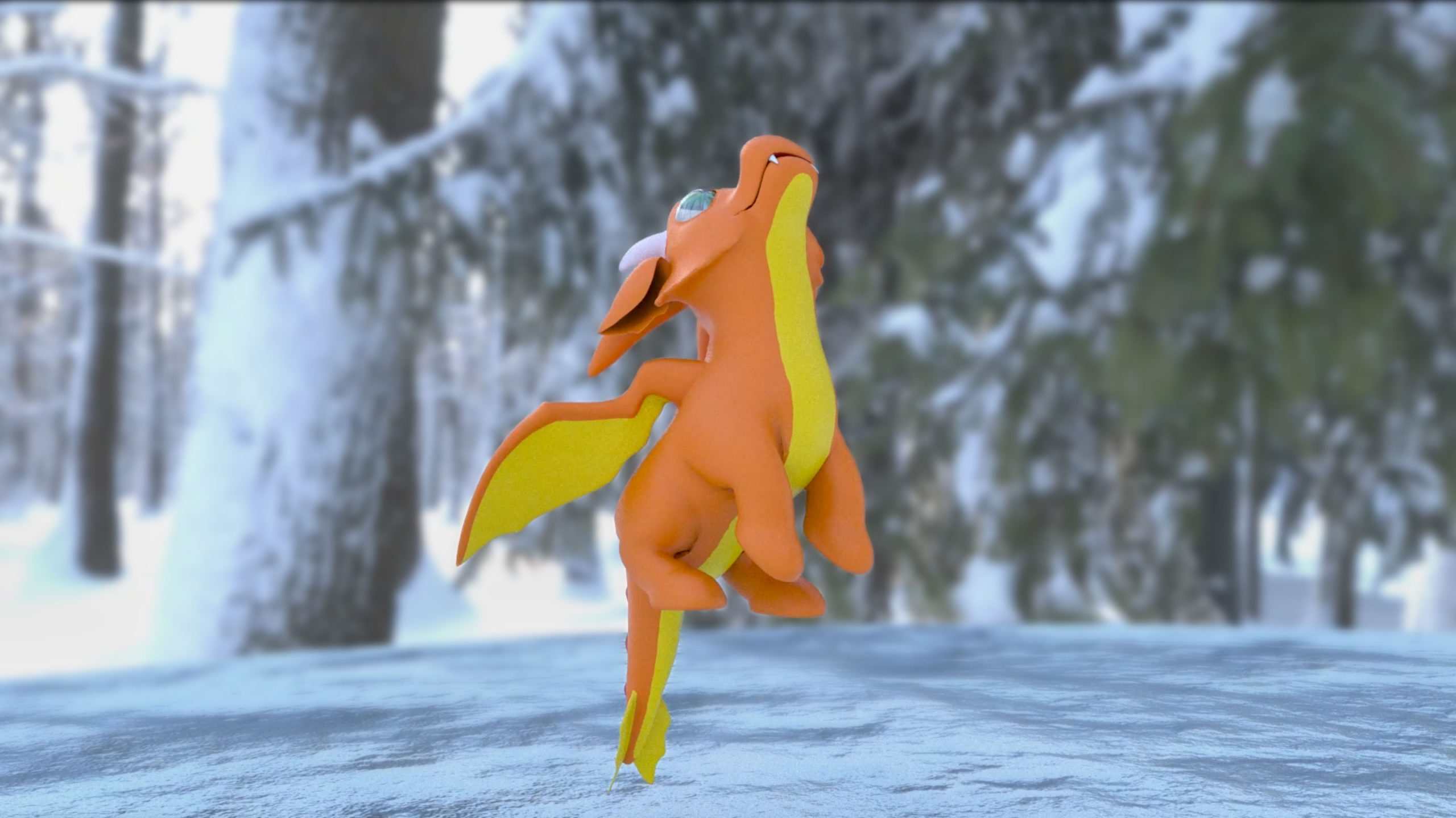 I created a little fire dragon living in an icy world. For the animation I chose a training sequence, in which he learns to roar an to fly