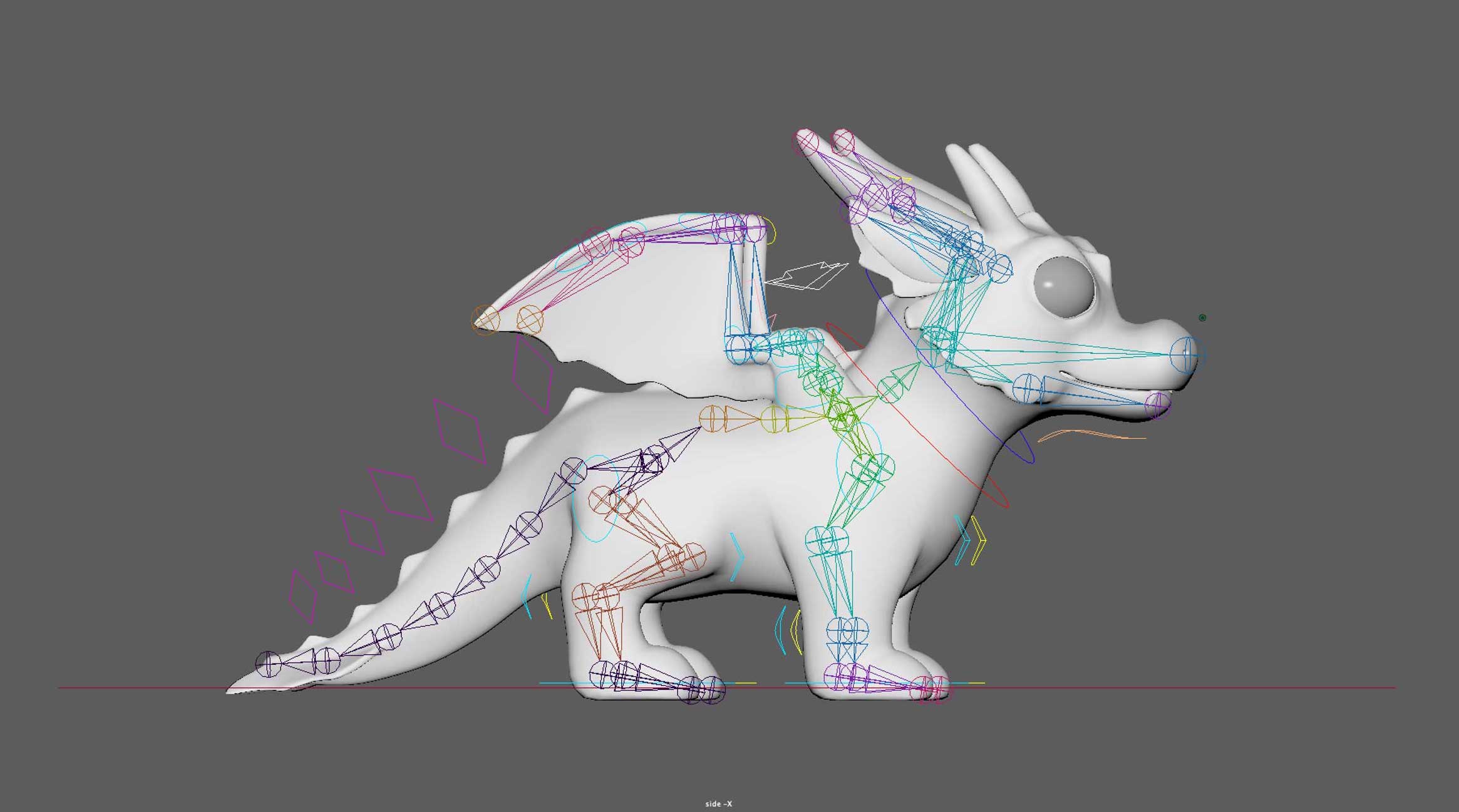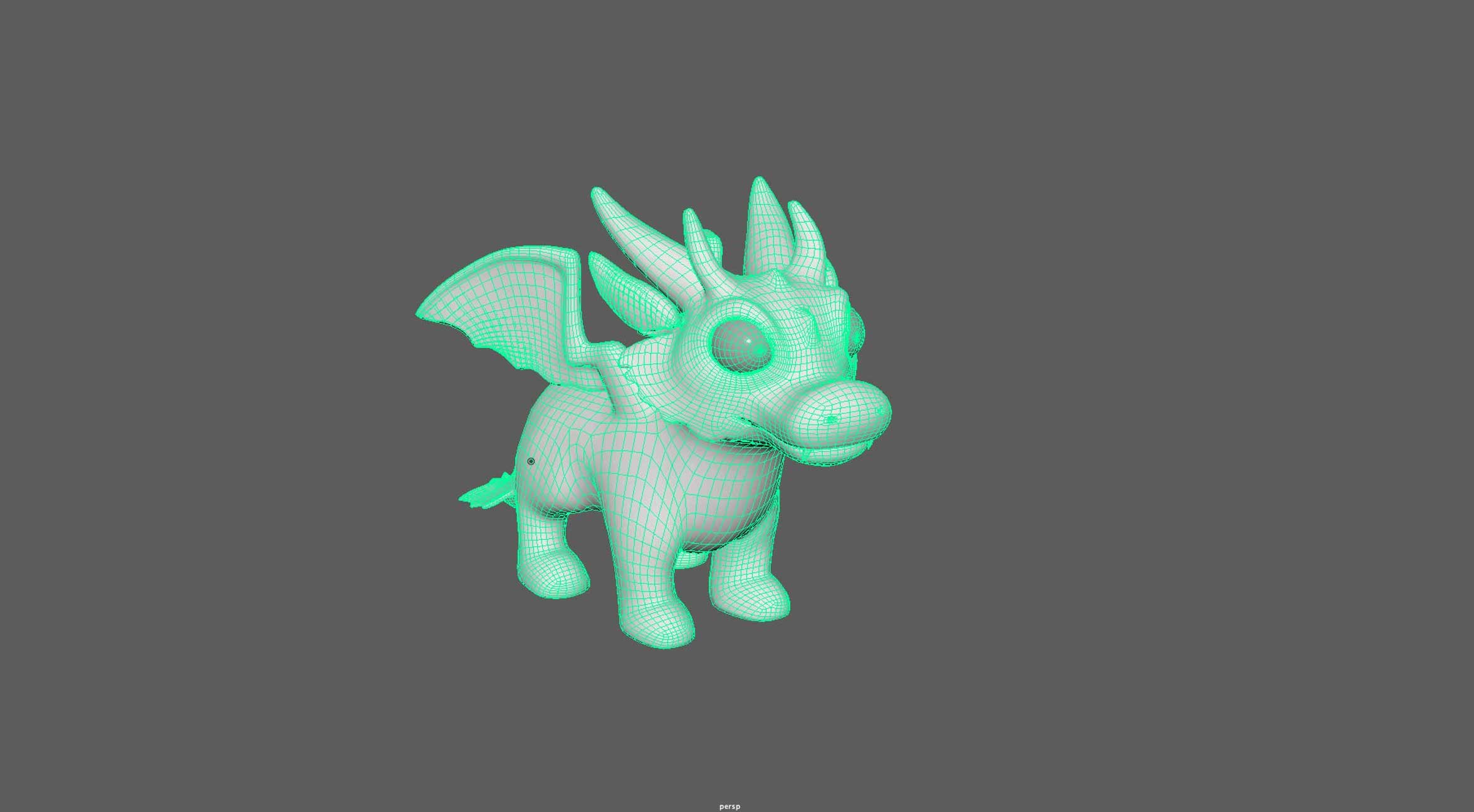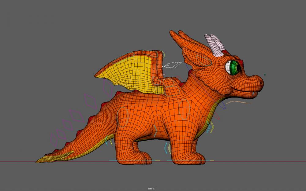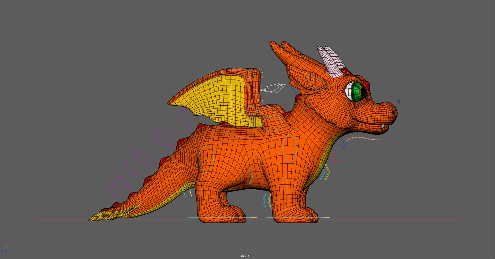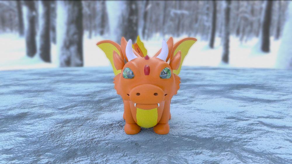 I created a little fire dragon living in an icy world. For the animation I chose a training sequence, in which he learns to roar an to fly
